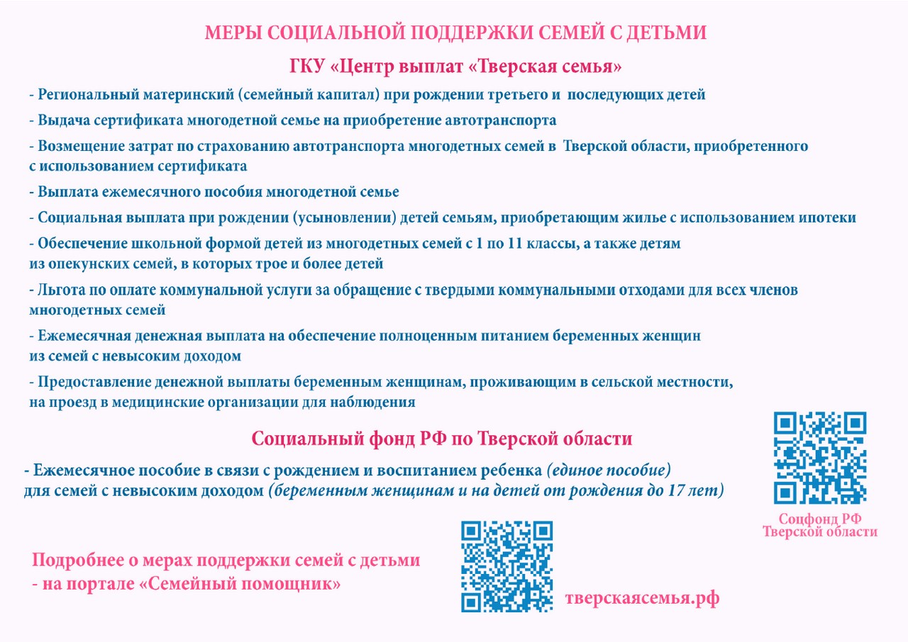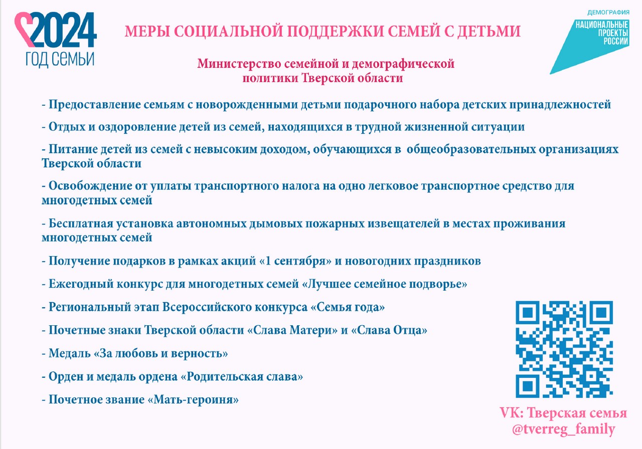 Министерство семейной и демографической политики Тверской области информирует жителей региона о мерах социальной поддержки семей с детьми