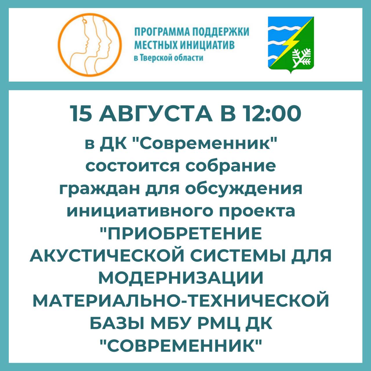 Инициативная группа, созданная для реализации инициативного проекта «Приобретение акустической системы для модернизации материально-технической базы МБУ РМЦ ДК «Современник» приглашает вас на собрание граждан, которое состоится 15 августа 2024 года в 12:00.