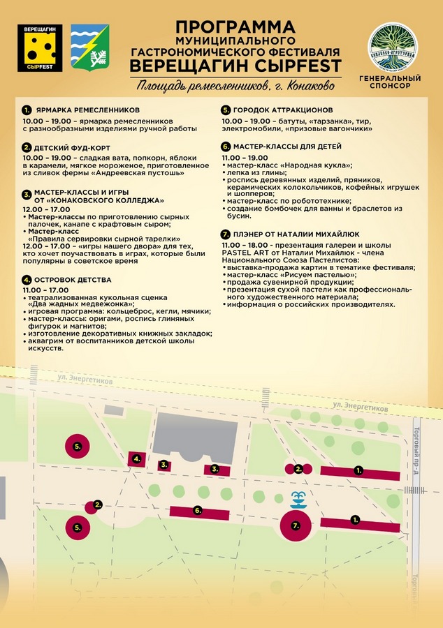 Для вас отдельные программы для детей и взрослых, мастер-классы и дегустации, фуд-корт с блюдами в состав которых входит сыр, пленэр с картинами в сырной тематике, разнообразная культурная программа, в которой примут участие лучшие творческие коллективы округа, а также приглашенные гости: российская поп-рок-группа «Братья Грим».