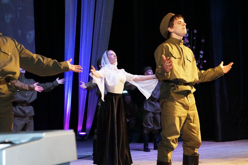 Концерт начался с лазерного шоу по мотивам песни «Журавли», после чего на сцену вышли ведущие в военной форме — и уже до финальных аккордов не давали зрителю забыть, по какому поводу сегодня здесь все собрались. Каждый номер был продуман, каждая песня (а в концерте исполнялись исключительно популярные песни военных лет) предварялась интересной мизансценой, объясняющей, почему именно здесь и сейчас прозвучит конкретная песня. Проводы на фронт, встречи однополчан, фронтовые байки, рассказы о героях и ранениях, возвращение домой — весь праздничный концерт был подчинен общему драматическому замыслу, зритель словно сопровождал солдат, которые расставались с домом, переживали страшные и опасные события фронтовой жизни и возвращались к своим родным. Все творческие коллективы ДК «Современник», принимавшие участие в юбилейном концерте, продемонстрировали удивительную слаженность, следование общему замыслу и профессионализм.