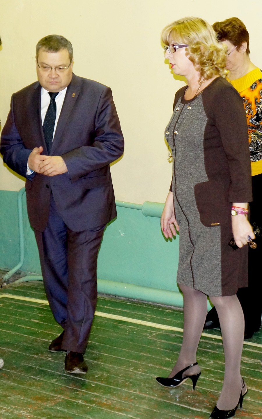 Директор школы Татьяна Владимировна Суркова рассказала о том, какие именно ремонтные работы проводились в школе в последние годы, и какие проблемы в техническом состоянии школьных зданий требуется решить в первую очередь. В частности, речь идет о состоянии спортивного зала школы. Именно отсюда руководители администрации начали знакомство с положением дел в школе. Поскольку в свое время здание школы №2 было построено по проекту, не предусматривающему в здании подвального помещения, при низком фундаменте полы первого этажа практически находятся на грунте. В связи с этим доски отсыревают, проседают, и это особенно заметно в спортивном зале. Как сказал учитель физкультуры школы Константин Бобров, спортивному залу необходим капитальный ремонт, включающий перестилание полов, замену лагов и укрепление фундамента. Кроме того, необходимо покрасить заново стены зала и отремонтировать раздевалки. Замены требует также часть спортивных тренажеров.