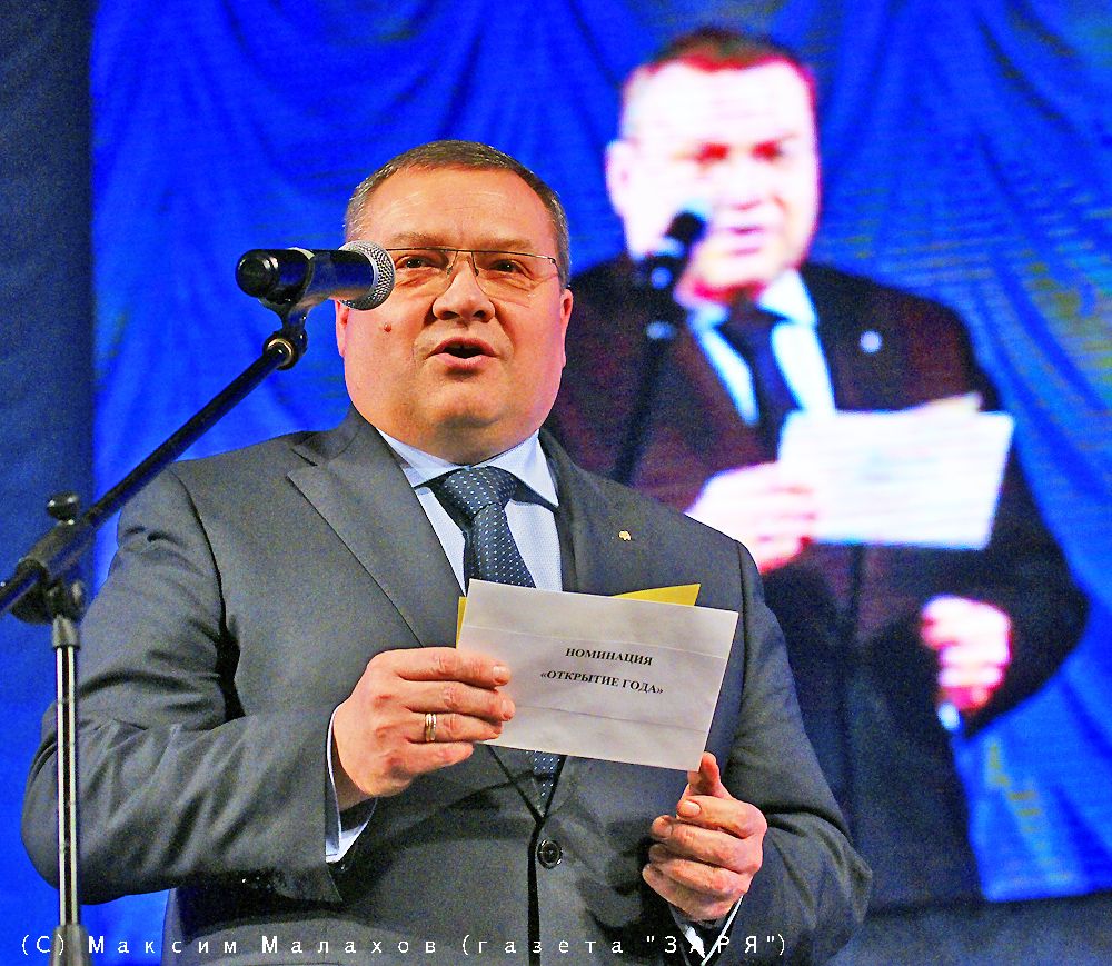 Заветный конверт с именем победителя на сцене вскрывал почетный гость церемонии Глава администрации Конаковского района Олег Владимирович Лобановский.