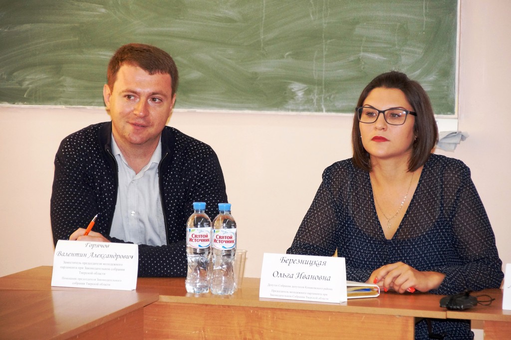 Пообщаться со студентами приехали председатель территориальной избирательной комиссии Конаковского района Сергей Фомченко, депутат Собрания депутатов Конаковского района, председатель молодежного парламента при Законодательном Собрании Тверской области Ольга Березницкая, заместитель председателя молодежного парламента при Законодательном Собрании Тверской области Валентин Горячов.