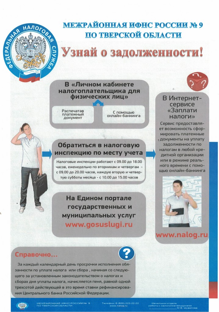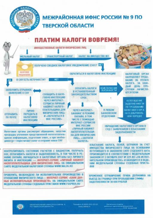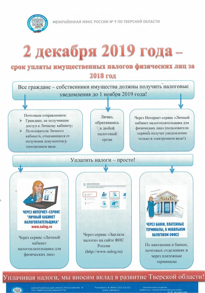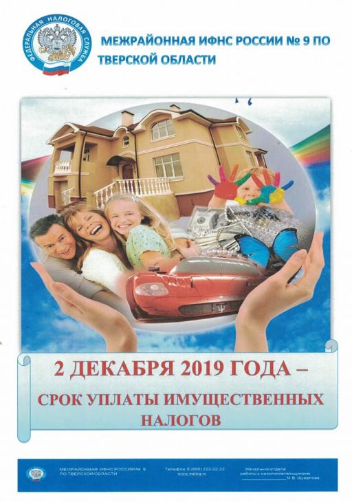 Межрайонная ИФНС России №9 по Тверской области информирует, что в 2019 году срок уплаты всех имущественных налогов: земельного, транспортного, налога на имущество физических лиц за 2018 год — не позднее 2 декабря 2019 года.