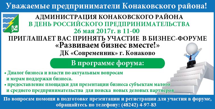 Администрацией Конаковского района в рамках трехлетней муниципальной программы поддержки малого и среднего предпринимательства на территории Конаковского района в День Российского предпринимателя, 26 мая, запланировано проведение тематического форума.